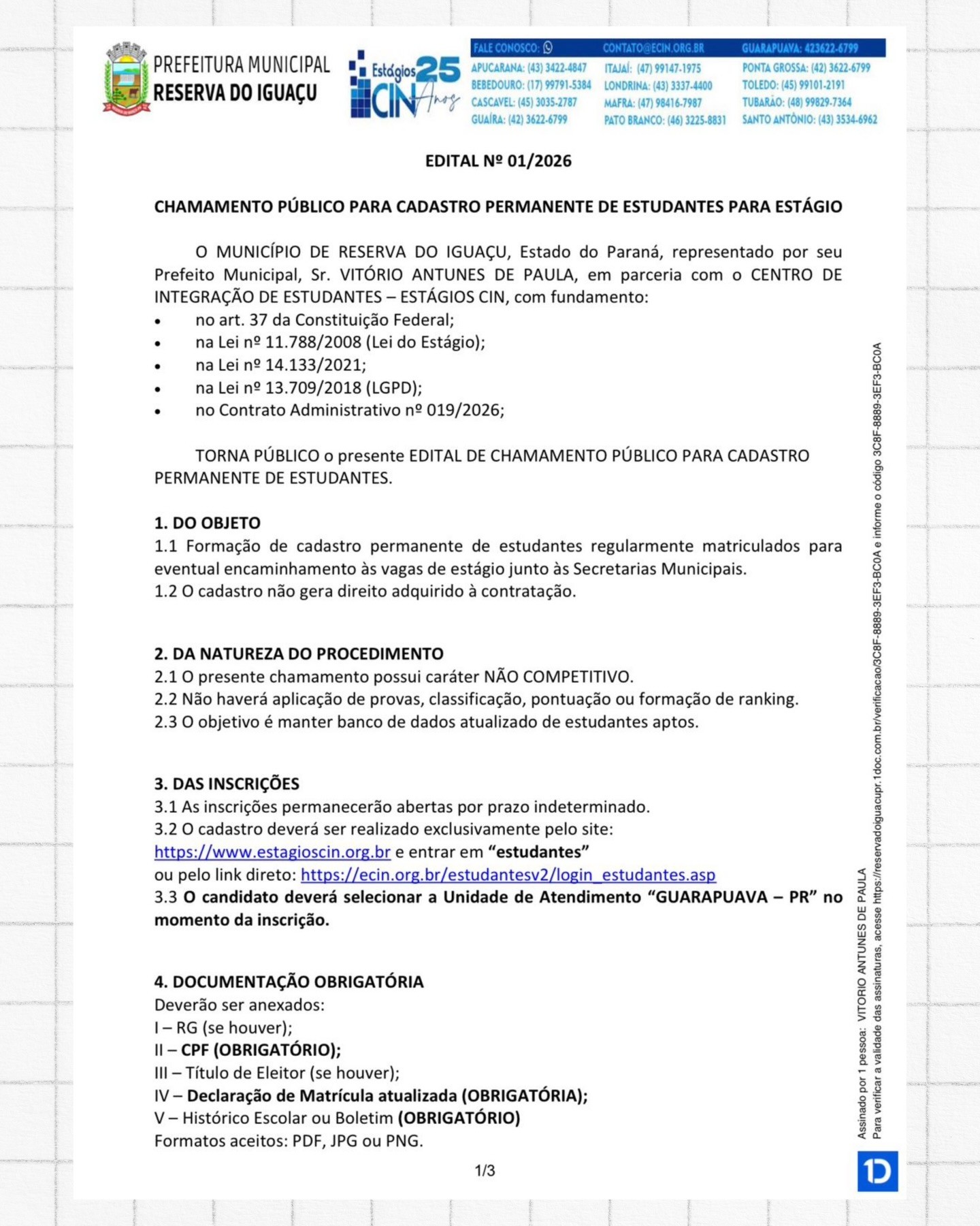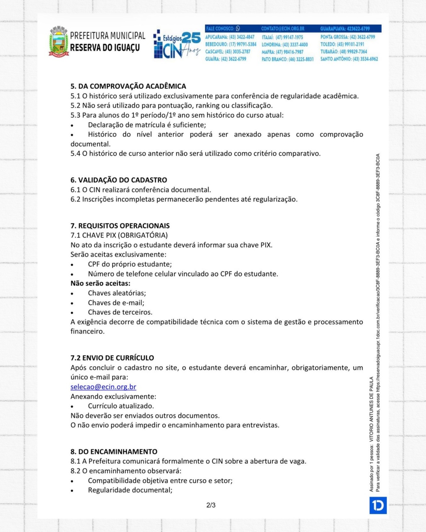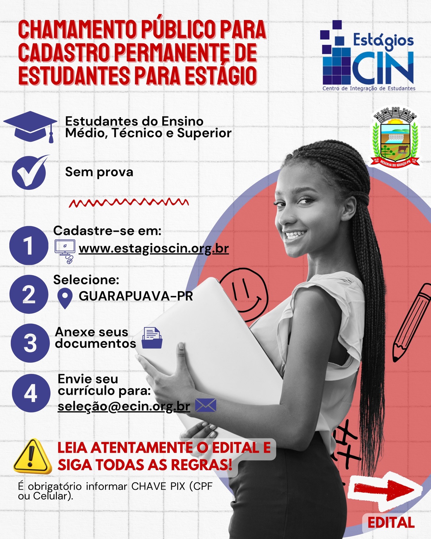 O cadastro deverá ser realizado exclusivamente pelo site: https://www.estagioscin.org.br e entrar em "estudantes" ou pelo link direto: https://ecin.org.br/estudantesv2/login_estudantes.asp